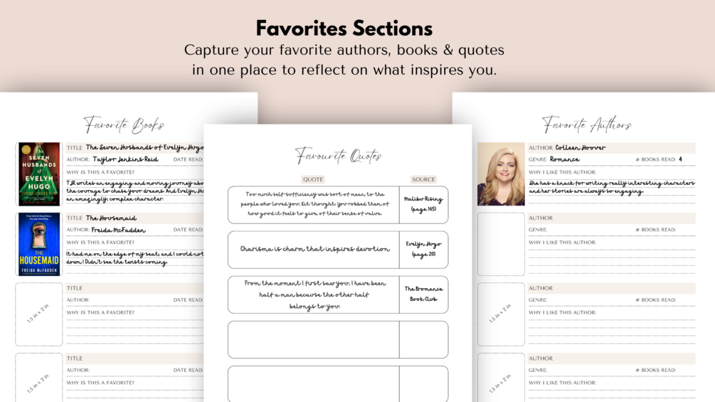 - Favorites Section to capture your most cherished moments —whether it’s a quote, an author, or a favorite book—so you can revisit and reflect on what matters most to you.