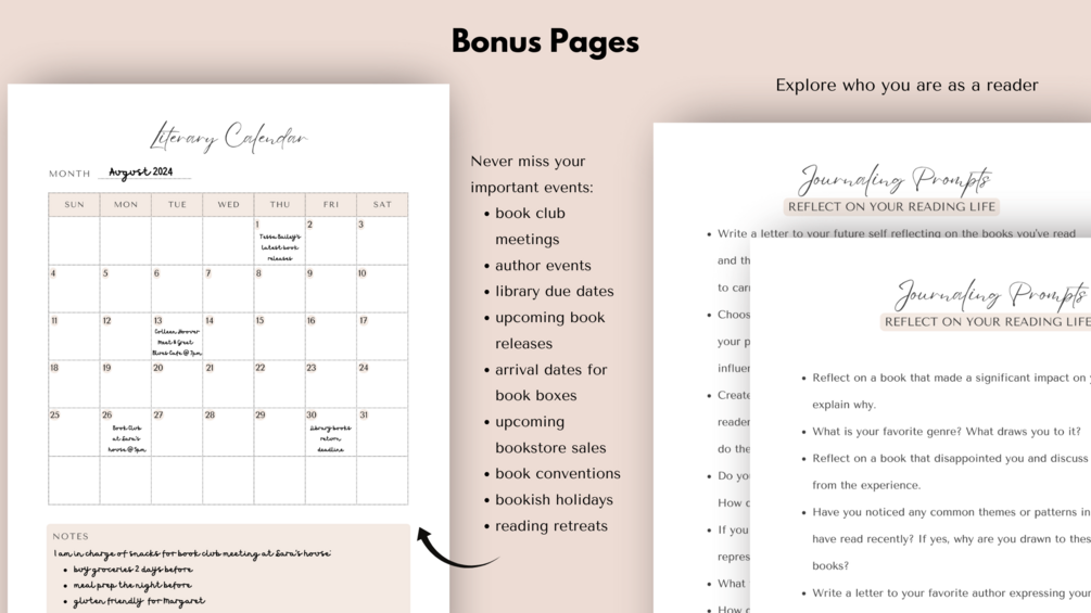 Bonus Pages: Stay inspired with extra pages for tracking your book club meetings, reflecting through journaling prompts, planning literary events with a calendar, setting fun goals like your bookish bucket list, and so much more.